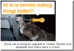 But you can only enjoying using it if you can get to the site! And lately, that hasn’t been a given. Now, maybe it’s just been my timing, but there have now been several times in recent days when I went to go post something and wound up seeing the kitten. While it’s definitely an amusing and cute way to do an “Please stand by” page, it doesn’t get around the fact that the service is unusable. I do realize that Twitter is suffering under growing pains and I’m certainly willing to give them the chance to fix it. I just do hope that I stop seeing that darn cat soon…