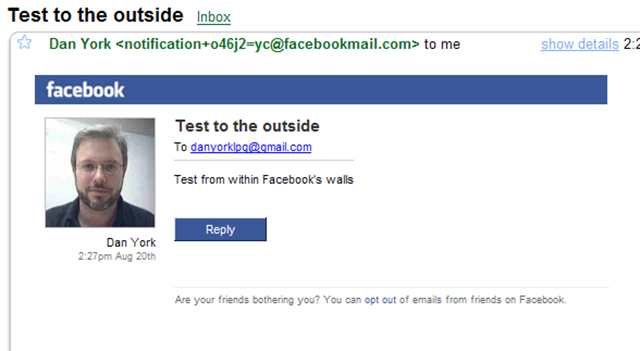 The sending email address shown for my Facebook message is: “notification+o46j2=yc@facebookmail.com“. I can reply back and the reply winds up in my Facebook inbox.