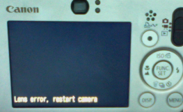 Woke up this morning to find that my Canon SD1000 point-and-shoot camera that I carry with me all the time at conferences seems to have died. When I start it up, I hear 6 beeps and then get this error "Lens error, restart camera". Yikes! Switched out the battery. Switched out the memory card. Tried various incantations. Still dead.