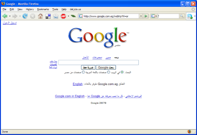 Logging onto the Internet here at the hotel in Cairo (for the glorious sum of $26 USD/day) had a rather amusing consequence – the main page for Google is entirely in Arabic! (click image for larger image) The text you enter in appears on the right side of the search box, and the results, as shown on the right (click image for larger image) appear on the right side as well. Google icon on the right… essentially everything the reverse of the way it appears on the English page (as is appropriate for the way it would be in the Arabic language).