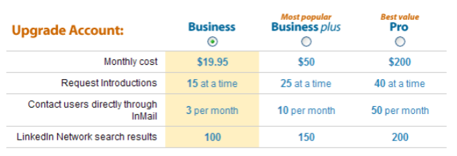 LinkedIn also attempted to make this easier with their “Introductions” feature, where you could send an “Introduction” directly to someone without knowing their address or using someone as a relay. As a (free) basic user you got 5 of these “Introductions” that you could use at any one time – or you could upgrade (as shown on right) to get more Introductions. I also did use this service as a way to connect to an ex-colleague and it worked fine.