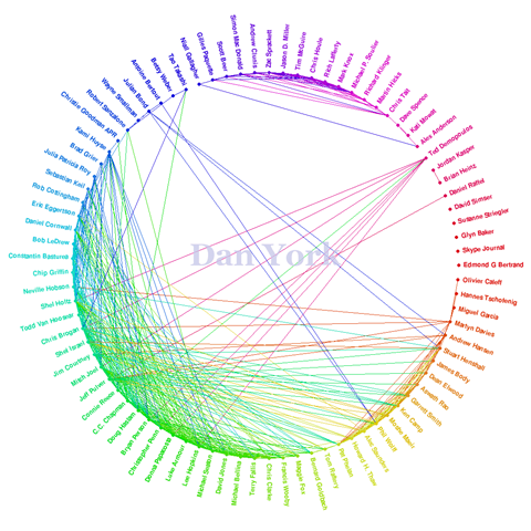 The circle shows part of a social network. Around the edge of the circle are Dan York’s friends. If two of them are connected by a line, it means that they are friends with each other. Relationships between different groups of friends (eg. “Home friends” and “University/College friends”) can often be seen in the circle. It’s also brightly coloured and looks pretty.