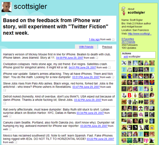 Twitter has been labeled many things… but I don’t know that I’ve yet seen anyone talking about it as an outlet for fiction.  However, Scott Sigler is now experimenting with it as exactly that.  This came about because last Friday (iPhone Day, in case you have somehow forgotten), Scott started a series of tweets (first one here) that escalated into what was called the “iPhone War”.  In a series of what looked like posts from an embedded war reporter (albeit one in a dumpster), he rapidly had Canada, Mexico and Russia invading the US to get all of our iPhones, the USA being wiped out and the ultimate collapse of civilization.   (Unfortunately with Twitter in order to see them you’ll need to go back in Scott’s Twitter page to see the posts – you also can get a taste by clicking the graphic on the right to see a larger version and some of the text.)  It was an entertaining diversion to read. (Hat tip to the tweet from C.C. Chapman that clued me in to it.)