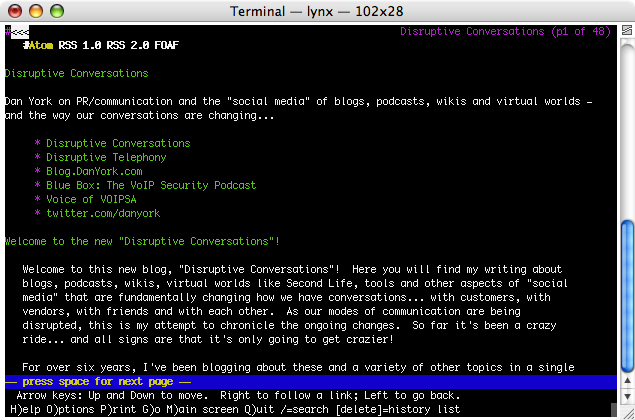 When I was complaining in a groupchat today about issues I was having with both Safari and Firefox on my MacBookPro, someone wisecracked that I should get “lynx” if I wanted performance. Having fond memories of lynx – but quite frankly having forgotten completely about it – I immediately I dived to the command line and typed “lynx”, but of course, it wasn’t installed. However, Apple provides lynx as a free download. If you’ve never seen lynx, it’s perhaps worth a look to see what “the Web” sort of looked like around 1993 before Mosaic came out. (Actually, it looked like the original “www” browser at info.cern.ch, but that’s another matter.)