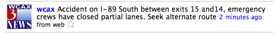 I was somewhat amused when local TV station WCAX started using Twitter… I first learned of it when they started following my twitter feed. At first I didn’t follow them in return (purely because I am getting a lot of Twitter followers and I like to check them out before just following them), but yesterday I decided to start following them purely to have another source of local news.