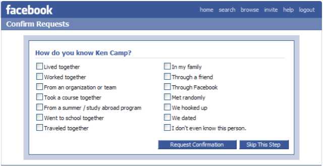 Adding someone as a friend, though, did create the dilemma of trying to indicate the relationship.  As you can see in the picture to the left (click for larger image), I’m asked to indicate my relationship with fellow blogger Ken Camp.    We haven’t lived or worked together… or been part of an organization… or taken a course or went to school.  I guess you could say we “Traveled together” in the sense that we’ve attended the same conferences… but that’s not really the intent.  We didn’t “meet randomly” and we certainly haven’t “hooked up” (assuming my interpretation of that is correct! 😉 or dated.  He’s not family and we didn’t meet through a friend or through Facebook.