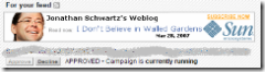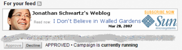 The newest campaign I was asked to approve, though, gave my head a bit of a spin. As you can see in the image to the right (click for a larger view), it’s a campaign by Sun Microsystems to promote CEO Jonathan Schwartz’s weblog!  As you’ll note, I approved it since I figured it might actually be something of interest to our listeners (and you can see my nice spray paint job in Windows Paint to obscure the campaign details :-).  But think about this for a minute…  here is a very large company spending some of its advertising dollars to promote a weblog through ads in various RSS feeds!